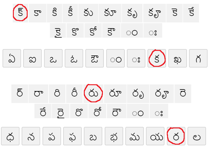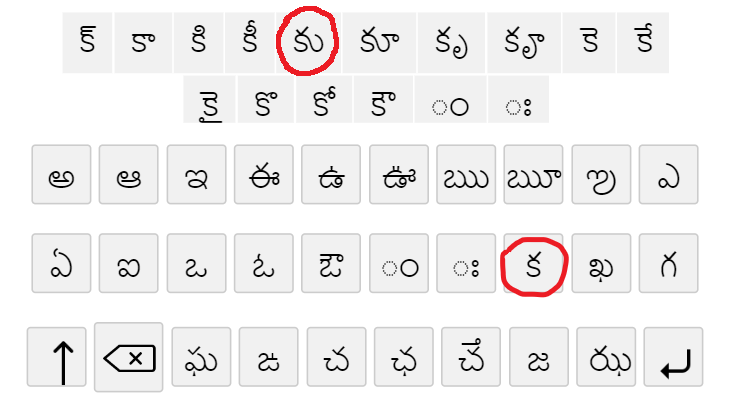 1. కు కావాలంటే: క బటన్ నొక్కితే, పైన క గుణింతములు వస్తాయి.